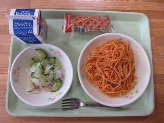 今日の給食の献立は、スパゲティミートソース、牛乳、ハムマリネサラダ、メープルドックです。