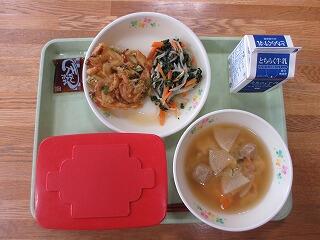 本日の給食の献立は、ごはん、牛乳、野菜のかき揚げ、天丼のたれ、和風和え、つみれ汁です。
