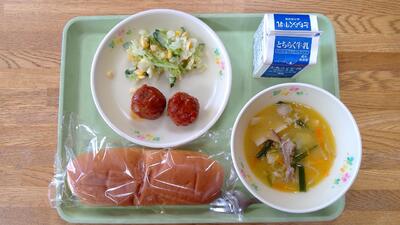 本日の給食の献立は、ミルクパン、牛乳、肉団子、コーンサラダ、タイピーエンです。