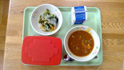 本日の給食の献立は、大麦ごはん、牛乳、チキンカレー、こんにゃくサラダです。
