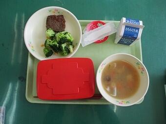 給食は、さつきランチ、ということで、鹿沼和牛ステーキ、ボイルブロッコリー、なめこ汁、とちおとめゼリー、牛乳でした。