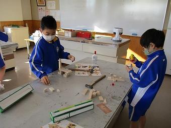 3年生が図工で「のこぎりひいてザクザクザク」の学習をしました。のこぎりで木材を切る学習です。どの子も意欲的にのこぎりを使い、さまざまな形に切り、自分なりの造形づくりを楽しみました。