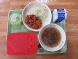 本日の給食は塩ジョイランチです。献立は、ご飯、牛乳、セルフタコライスの具、もずくスープ、マスカットゼリーです。
