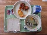 本日の給食の献立は、食パン、チョコ、牛乳、オムレツ、ラタトゥイユ、ラビオリスープです。中学生の大きい牛乳にびっくりですね。