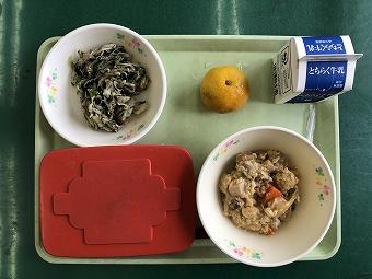 今日の給食は、ごはん、牛乳、親子煮、海苔和え、みかん、でした。