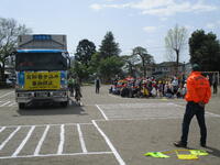 鹿沼市交通対策係の方、トラック協会の方、鹿沼警察署の方、駐在さんに御協力いただき交通安全教室を行いました。今回は、トラックの巻き込み事故の実演と横断歩道の渡り方がテーマです。トラックの巻き込みでは、子どもたちは驚きとともに学んでいました。その後、トラックの運転席に座らせていただき、運転手さんからは意外と周りが見えにくいことを知り、自分たちが注意しないといけないと実感しました。横断歩道の渡り方では左右後方確認と手を挙げて自分の存在を知らせることの重要性を学びました。