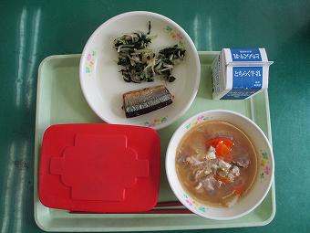 給食はごはん、さんま塩焼き、海苔和え、豚汁、牛乳でした。