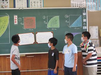 6年生が算数で円の面積について学習しました。どのようにしたら面積が求められるか、教材を使ったり、話し合ったりしながら、みんなで考えを練り合ってしました。