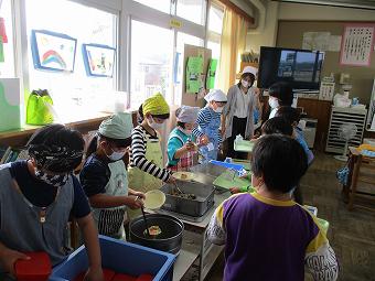給食の時間、給食で余分になったおかずを毎日、職員室から各教室に届けていますが、今週から運動会で使ったウーバーイーツなどの装飾品を背負って届けています。どのクラスもそのスタイルでおかずを届けると、一斉に笑顔になります。どの子も給食が大好きです。今日の給食は、ごはん、鶏肉の香味焼き、和風和え、根菜のごま汁、牛乳でした。