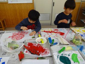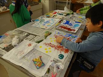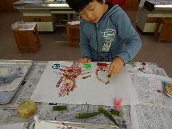 1年生が図工で版画を行いました。野菜のカット面をハンコにして、色とりどりの絵の具をつけ、想像の翼を広げながら、楽しそうに制作していました。