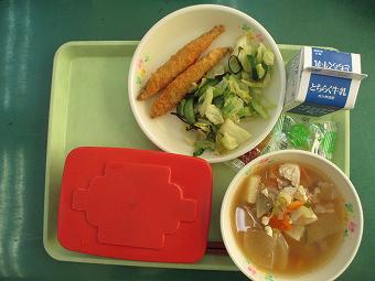 給食は、ごはん、ししゃもフライ、塩昆布和え、豚汁、果汁グミ、牛乳でした。