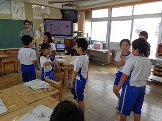 4年生が4時間目に外国語活動を行いました。最初に『ジョリーフォニックス』を使って、英語の発音を学習しました。『ジョリーフォニックス』は、お話や動作、歌などを通して、楽しみながらアルファベットの発声方法を覚える学習法です。続いて朝、昼、晩のあいさつの仕方を友達同士で行ったり、「I LIKE~」「I DON'T LIKE~」を学習したりしました。どの子も楽しそうに英語を学んでいました。