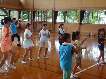 サマースクール3日目はエアロビクス教室を行いました。講師に伊藤加代子先生をお迎えし、子ども達、保護者、教職員がエアロビに挑戦しました。講師の先生の合図に従って、音楽に合わせて歩いたり、踊ったり。エアロビにピップホップの要素を取り入れて、2時間、楽しく、しっかりと活動しました。