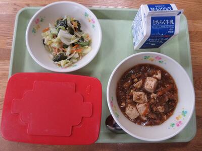 本日の給食の献立は、ごはん、牛乳、麻婆豆腐、中華和えです。