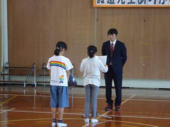 2年半本校で勤務した渡邉先生とのお別れ式がありました。代表児童がお別れの言葉を読み、花束を贈呈した後、渡邉先生から「ありがとうの気持ちをこれからも忘れないでいてください。」というあいさつをいただきました。その後、みんなで「旅立ちの歌」、そして「校歌」を歌いました。途中すすり泣く声もあちこちから上がるなど、最後まで皆、渡邉先生との別れを惜しんでいました。