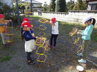 1年生が生活科で、4月に種を植え、これまで丹精に育ててきたアサガオのつるを採取して、オリジナルのリースづくりに挑戦しています。まずはつるだけで形をつくりました。これからさまざまな装いを身に付けて、学習発表会にお披露目する予定です。ぜひご期待ください。