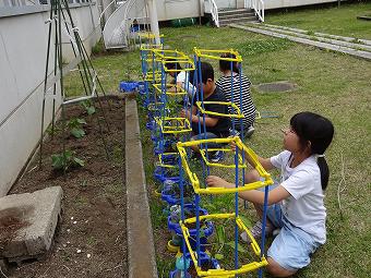 2年生が生活科で野菜の支柱を立てました。どの子も野菜の生長を楽しみにしています。