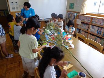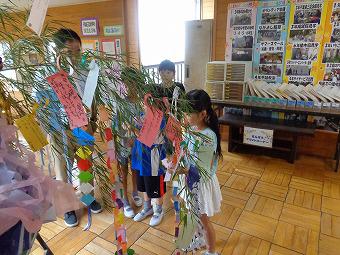 KLVの皆さんが、高学年昇降口前と図書室に、七夕飾りのついた竹を用意してくださったので、学年ごとに願いを書いた短冊を竹に取り付けました。「今年も学校の思い出がたくさんできますように。」「家族が幸せでいられますように。」・・・。すべての願い事が天に届きますように。