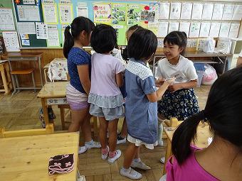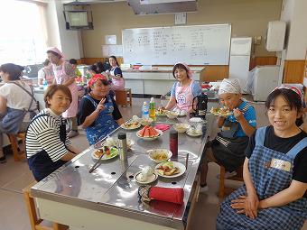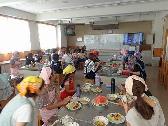 サマースクール第1目は「料理教室」でした。鹿沼市食生活改善推進委員会南押原支部の皆さん、鹿沼市栄養士さん、そして保護者の皆さんにお手伝いいただき、子ども達は、食育もかね、楽しく料理に取り組みました。献立は、カルシウムおにぎり、焼き春巻き、切り干し大根のカレー炒め、季節のフルーツです。どの子も一生懸命、包丁で食材を切ったり、レシピに従って、調理をしたりしました。すべてが完成すると、それぞれの班で、地域の方や保護者の方と楽しくおしゃべりをしながら、会食をしました。会食後は食改委員の方が、パネルシアターで食育の大切さを教えて下さいました。皆で協力し、食の大切さを感じながら過ごすことのできたサマースクールでした。