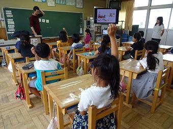 2年生が3時間目に外国語活動を行いました。ALTの先生、担任の先生と一緒に、ジョリーフォニックスをしたり、あいさつを英語で行ったり、I LIKE~の文をペアになって言い合ったりしました。どの子も英語を楽しみながら学習していました。