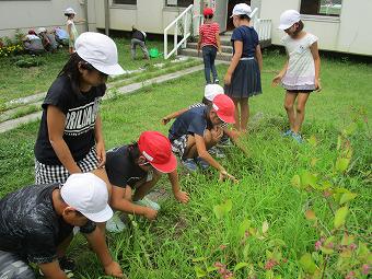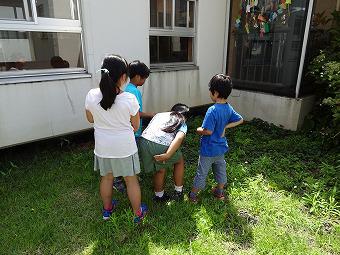 2年生が生活科の時間に、『夏の虫』さがしを行いました。雲の様子も、草花の勢いも、もう夏本番です。中庭や校庭の隅などをみんなで探しました。かなへび、バッタ、カエル、クワガタの雌。虫かごに入れ、教室前ベランダに。宝物がまた増えました。