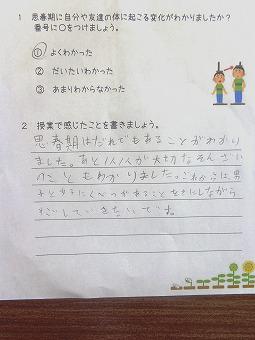 2時間目、4年生の保健の時間に養護教諭が授業をしました。「思春期にあらわれる変化」の単元です。大人と子供の男女の後ろ姿の写真を見ながら違いを考えたり、ゲームを通して、思春期に現れる体の変化について学んだりしました。体の変化は誰にもあり、個人差があること、命がつながっていく上でとても大切なこと、などを子ども達は、真剣に楽しく学んでいました。ふりかえりでは、「思春期はだれにでもあり、一人一人が大切な存在であることがわかりました。」「体にはとても大事な時期があるんだな、ということがわかりました。」など、どの子も一生懸命、ふりかえりカードに自分の考えを書き記していました。