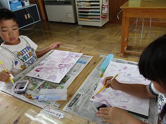 1年生が自分のアサガオの花から搾り出した色水で、絵を描きました。どの子も、とてもきれいな青紫色の絵ができあがりました。