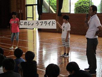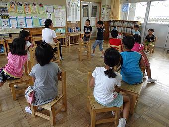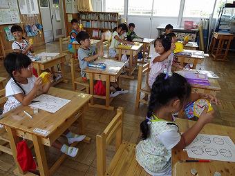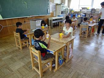 1年生にとって初めての小学校生活もすでに三ヶ月が過ぎ、1学期も終わりに近づきました。3時間目、1年生がお楽しみ会をやりました。みんなで話し合って決めたプログラムは、ハンカチ落とし、椅子取りゲーム、シロクマジェンカです。どのゲームも、おおいに盛り上がり、楽しいひとときを過ごしました。