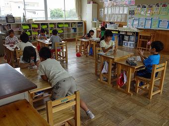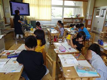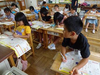 1・2年生が書写や生活科の時間に、担任の先生に向けた「暑中みまい」を書きました。郵便局でもらったはがきの書き方を見ながら、宛名書きから本文まで、どの子も一生懸命、心のこもった暑中みまいを書いていました。書き終わったら夏休み中に、実際に自分でポストに投函して、担任の先生の家に届くことになります。