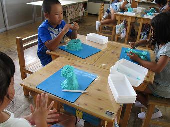5,6時間目、3年生が図工の時間に「にぎってひねってひらめいて」の学習をしました。粘土の1つのかたまりから、握ったり、ひねったりしながら、想像の翼を広げて、自分だけの島を作ります。どの子も目を輝かせて、世界にたったひとつの「自分だけの島」作りに没頭していました。