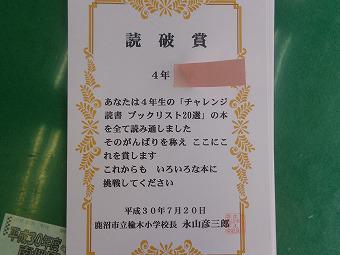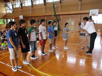 終業式後、表彰集会を行いました。まず読破賞の表彰をしました。1学期のチャレンジ読書ブックリストすべての本を読んだ子に与えられる賞です。6名の児童が表彰され、図書委員会特製のしおりをもらいました。すべての児童にとって、これからの読書の励みとなることでしょう。続いて体操大会で優勝した児童の表彰を行いました。それぞれ、多くのがんばりが実っています。