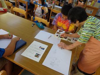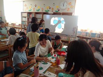 サマースクール2日目は影絵教室でした。楡木KLVの皆さんが、影絵の作り方を、ていねいに説明してくださいました。好きな題材を選んで原画を描き、はさみやカッターで切り取って、そこにセロハンなどを貼っていきます。可動箇所は割ピンなどを使います。できた影絵はOHPで映してみます。説明が終わると子ども達はさっそく制作に取りかかりました。どの子もKLVの方や先生にアドバイスを受けながら夢中になって影絵作りに精を出していました。最後にできた影絵を全員で観賞しました。どの影絵も表情豊かで思いのこもった作品に仕上がっていました。