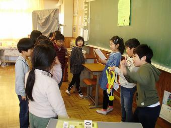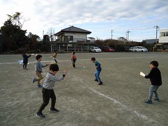 1年生が生活科で昔のおもちゃ体験を行いました。竹とんぼ、羽子板で、子供たちは夢中になって遊んでいました。