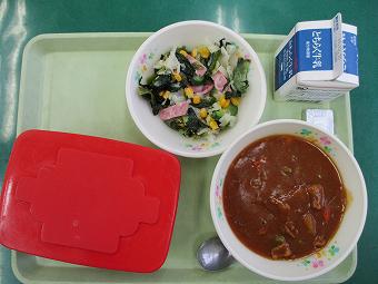 給食は牛乳、麦ご飯、ポークカレー、ほうれん草サラダ、ベビーチーズでした。