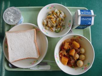 今日の給食は、「さつきランチ」ということで、県産小麦の食パン、とちおとめジャム、インド煮、かんぴょうのサラダ、県産ヨーグルトでした。