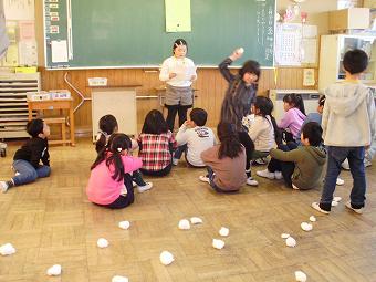 1年生が生活科で昔の遊びを体験しました。お手玉やけん玉に、子供たちは夢中になって取り組んでいました。