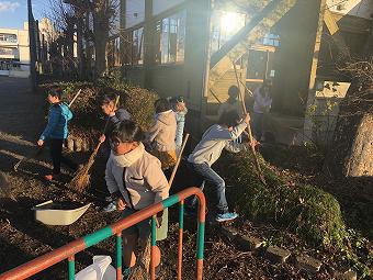 3年生が朝、自主的に落ち葉はきを行いました。冬の冷たい空気のなか、子供たちは一生懸命、進んで落ち葉を集めていました。