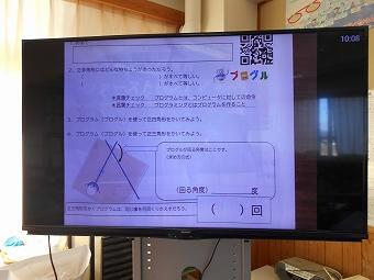 5年生がプログラミングの学習をしました。プログルというソフトを使って、多角形を描くプログラムを作成します。多角形を描く命令をみんなで考えながら論理的思考を育てることをねらいとしています。どの子も意欲的に考え、プログラムを作成していました。