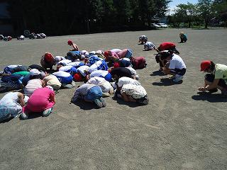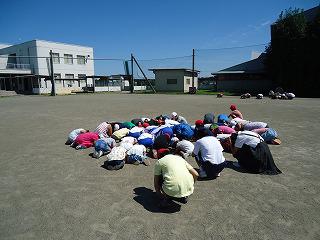 竜巻が発生した場合、竜巻接近の緊急放送を聞き、自らの判断で安全な場所に移動し身を守る行動を理解させ実践しました。この時期は竜巻や台風が発生しやすいので、日ごろからテレビなどで天気予報で情報収集できる力も必要と考えています。マイチャレンジで本校にきている南押原中の2人の生徒も参加しました。