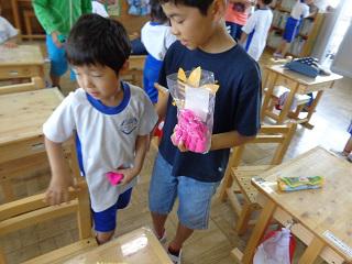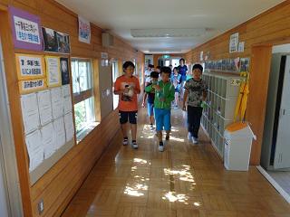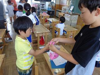 明日の運動会での全校ダンスは「勇気100パーセント」、なかよし班(縦割り班)で踊ります。朝の会の前に、6年生が、各クラスを訪れて、それぞれのなかよし班のイメージカラーのリストバンドを配って回りました。リストバンドの付け方を1、2年生に教えている6年生の姿に、頼もしさと優しさを感じた、すがすがしい朝でした。