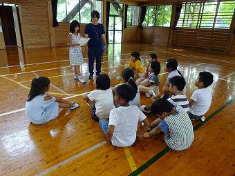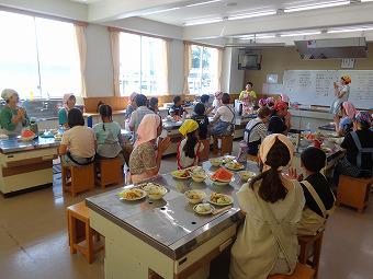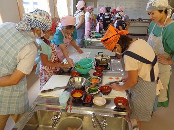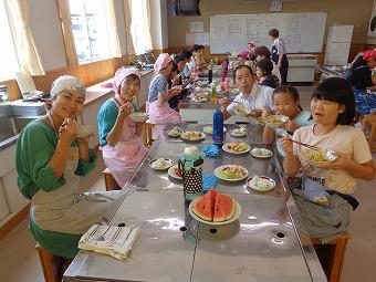 サマースクール第1目は「料理教室」でした。鹿沼市食生活改善推進委員会南押原支部の皆さん、鹿沼市栄養士さん、そして保護者の皆さんにお手伝いいただき、子ども達は、食育もかね、楽しく料理に取り組みました。献立は、カルシウムおにぎり、焼き春巻き、切り干し大根のカレー炒め、季節のフルーツです。どの子も一生懸命、包丁で食材を切ったり、レシピに従って、調理をしたりしました。すべてが完成すると、それぞれの班で、地域の方や保護者の方と楽しくおしゃべりをしながら、会食をしました。会食後は食改委員の方が、パネルシアターで食育の大切さを教えて下さいました。皆で協力し、食の大切さを感じながら過ごすことのできたサマースクールでした。