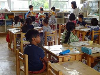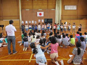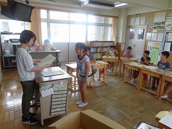 3時間目、1学期の終業式を行いました。最初代表児童6名が、「町探検で井戸の水を汲んだことが想い出です」「1学期は初めての習字をがんばりました」「夏休みは早寝早起きとお手伝いをがんばりたいです」など、1学期の想い出や夏休みにがんばることを発表しました。その後、1学期の活躍をまとめたプレゼンを観賞しました。式終了後、学習指導主任と児童指導主任が、夏休みの過ごし方について話をしました。1学期、多くの地域の方、保護者の方に支えられ、楡小教育活動は実り多いものとなりました。ありがとうございました。「チーム楡小、ハッピーリレー!」をスローガンにこれからも楡小からたくさん幸せを発信していきたいと思いますので、よろしくお願いします。