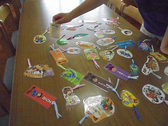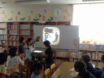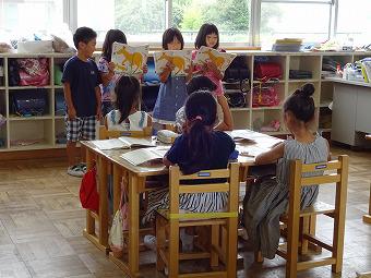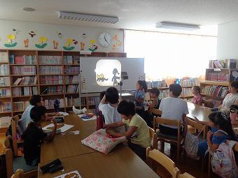 サマースクール2日目は影絵教室でした。楡木KLVの皆さんが、影絵の作り方を、ていねいに説明してくださいました。好きな題材を選んで原画を描き、はさみやカッターで切り取って、そこにセロハンなどを貼っていきます。可動箇所は割ピンなどを使います。できた影絵はOHPで映してみます。説明が終わると子ども達はさっそく制作に取りかかりました。どの子もKLVの方や先生にアドバイスを受けながら夢中になって影絵作りに精を出していました。最後にできた影絵を全員で観賞しました。どの影絵も表情豊かで思いのこもった作品に仕上がっていました。