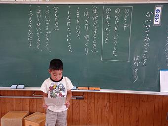 1年生が国語の時間に、「夏休みのことを話そう」をめあてにした学習を行いました。話すとき、聞くときの約束を確認した後、どの子も一生懸命に発表し、聴いている子も、真剣に聴いたり、質問したりしていました。