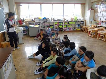 KLVの方が1,2年生に読み聞かせをしてくださいました。ハロウィンにちなんで「大きなかぼちゃ」という絵本です。読み進むうちに、子ども達からは、「何かにしている。」という声があがりました。読み終えて、KLVの方から、「この絵本のアメリカの作家の方が、ロシアの絵本「大きなカブ」が小さな頃から大好きで、この本を書いたのですよ。」というお話を聞くと、子ども達は、「なるほど。」と納得していました。KLVの方から折り紙で作ったハロウィンの飾りをいただき、子ども達は大喜びでした。