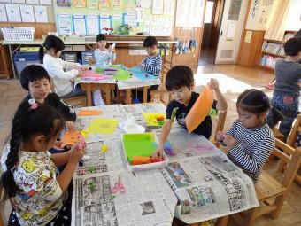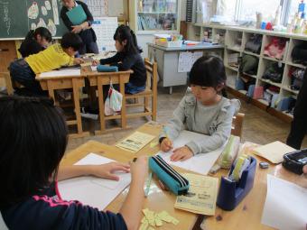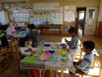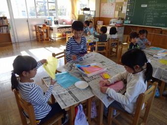 1年生が図工の時間に「くしゃくしゃがみからうまれたよ」の学習をしました。お花紙を使って立体作品をつくる活動です。花紙の特徴を生かして、まるめたり、のばしたり、切ったり、重ねたり、包んだり。みんないろいろ工夫しながら楽しそうに作品作りに没頭していました。