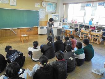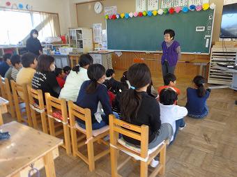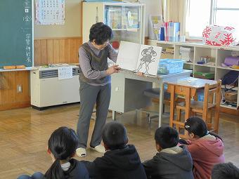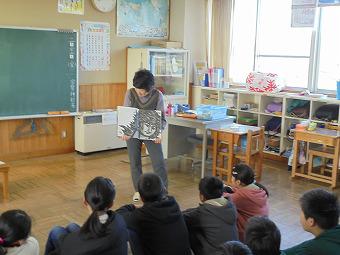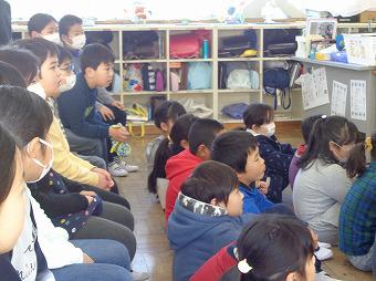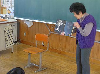 KLVの方が2名来校し朝の学習の時間に、1・2年生と5・6年生に読み聞かせをしてくださいました。1・2年生には、「まくらのせんにん」と「おおきくなるってことは」の2冊の絵本を読んでくださいました。読み終わってから、今日が今年最後、ということで、素敵な手製のしおりをプレゼントしていただきました。子ども達は思いがけない贈り物に大喜びでした。