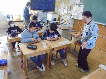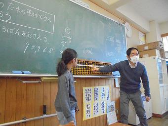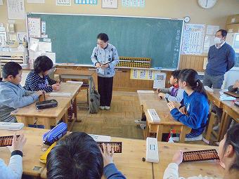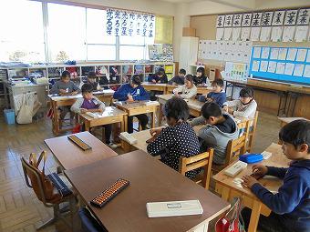 3年生が地域のそろばん講師の方をお招きして、算数でそろばんの学習をしました。初めてのそろばんに、最初はとまどいながらも、興味津々に玉の扱い方、簡単なたし算などを学習しました。日本の誇れる計算機のやり方を知り、どの子もとても楽しそうでした。
