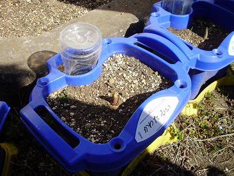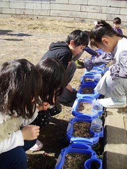 1年生が来年度の1年生へのプレゼントとして植えたチューリップの球根を、観察しました。少しだけ出てきた芽を見つけると、どの子もとても嬉しそうでした。