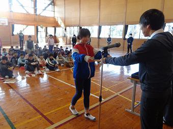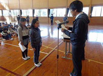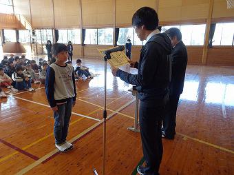 また、大縄記録会の後に全校表彰を行いました。「小さな親切標語」、理科展や読破賞、書き初め展など、友達の良さをみんなで祝福しました。